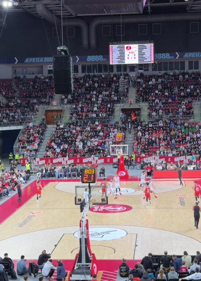 high-angle view of a basketball game in progress. Players in red and white uniforms are actively engaged in the game on the court, while others stand on the sidelines. A large screen above the court displays the game's live action, along with the scoreboard. The arena is packed with spectators filling the stands. The scene is well-lit, typical of an indoor sports arena.