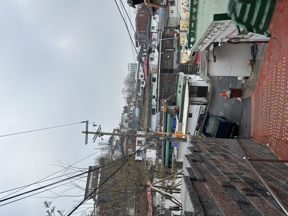 An elevated view shows a narrow street winding through a densely populated neighborhood. Buildings are closely packed, with a mix of aged and painted facades. Numerous utility lines crisscross the scene. A blue truck is parked along the side of the street. The sky is overcast. A textured wall and railing frame the lower right foreground, offering a perspective from a higher vantage point.