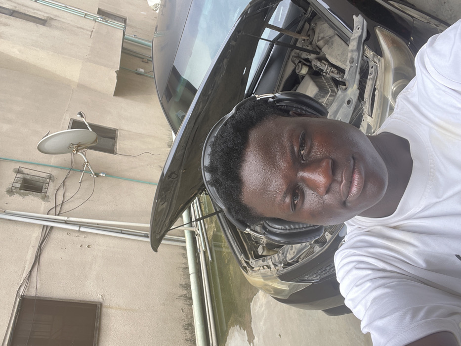 A young Black male, approximately 20-30 years old, with short, dark curly hair, is depicted in a close-up selfie, looking directly into the camera with a neutral expression. He wears a white t-shirt and large black over-ear headphones. Behind him, a dark-colored sedan has its hood fully open, revealing the engine compartment with visible components such as the battery and air filter box. The vehicle is positioned on a concrete or paved surface, part of which is covered by a pool of standing water reflecting the sky. In the background, a light-colored building wall is visible, featuring two windows (one with a dark frame, another with a visible metal grate), a white satellite dish mounted on the wall, and multiple white PVC pipes running vertically and horizontally. This scene is located in Badore, Nigeria.