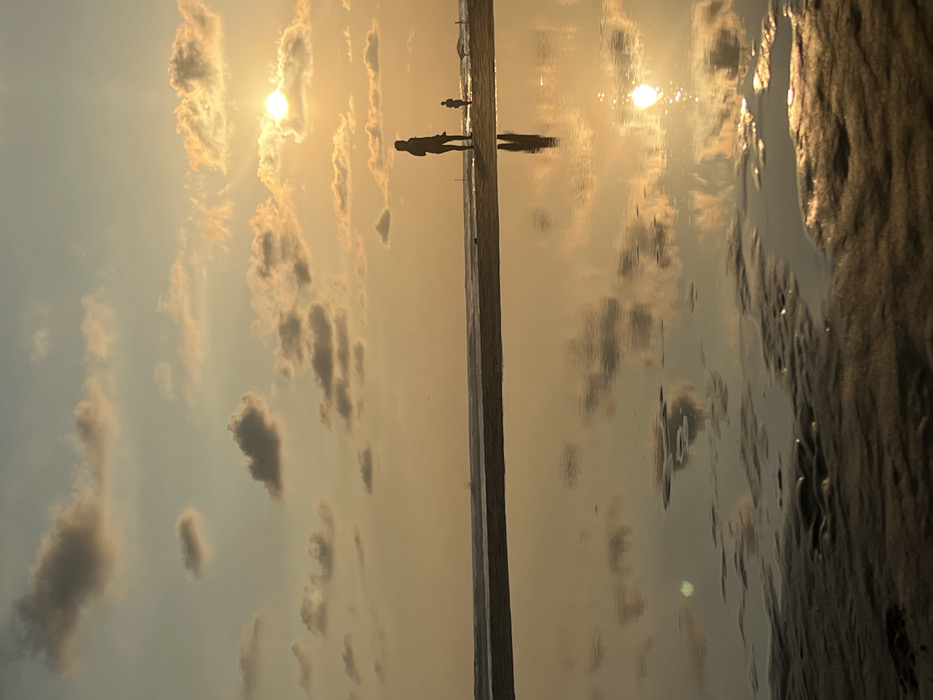 The image depicts a sunset scene on a beach in Kathaluwa, Sri Lanka. The sky, rendered in warm golden and orange tones, features a bright, circular sun partially obscured by clouds on the upper right side. Scattered cumulus clouds are visible across the expanse, reflecting the sun's light. In the midground, two human figures are silhouetted against the bright horizon. A taller individual stands on the left, facing generally towards the right. To their right stands a significantly smaller individual, also in silhouette. Both figures appear stationary on a sandy strip separating the ocean from a foreground water body. The ocean is visible as a horizontal band beyond these figures, with subtle waves breaking. The lower half of the image is dominated by a large, tranquil pool of water on the beach, which acts as a reflective surface. This pool clearly mirrors the golden sky, the scattered clouds, the bright sun, and the silhouettes of both individuals, creating a symmetrical reflection. The immediate foreground consists of dark, wet sand displaying textured ripples and depressions. The scene is characterized by strong backlighting from the setting sun.