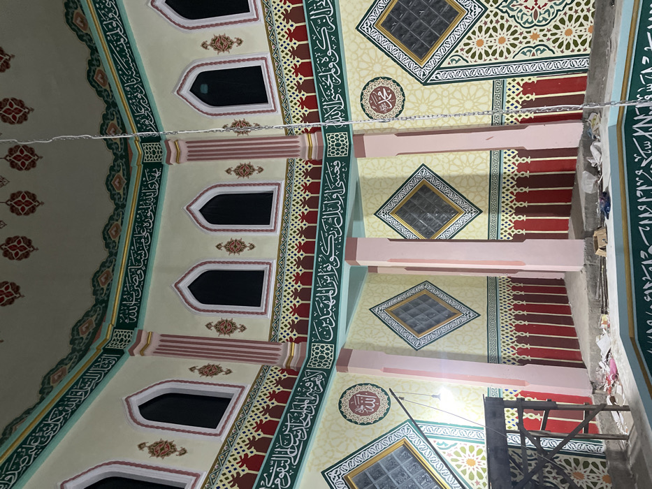 The interior of a mosque features intricate decorative elements. One side exhibits a series of arched windows punctuated by slender columns, all framed by detailed borders with Arabic script and geometric patterns. The opposite side presents diamond-shaped window-like designs. Pillars divide the space, painted with a pale pink hue. The ceiling is adorned with elaborate geometric and floral designs in light colors.