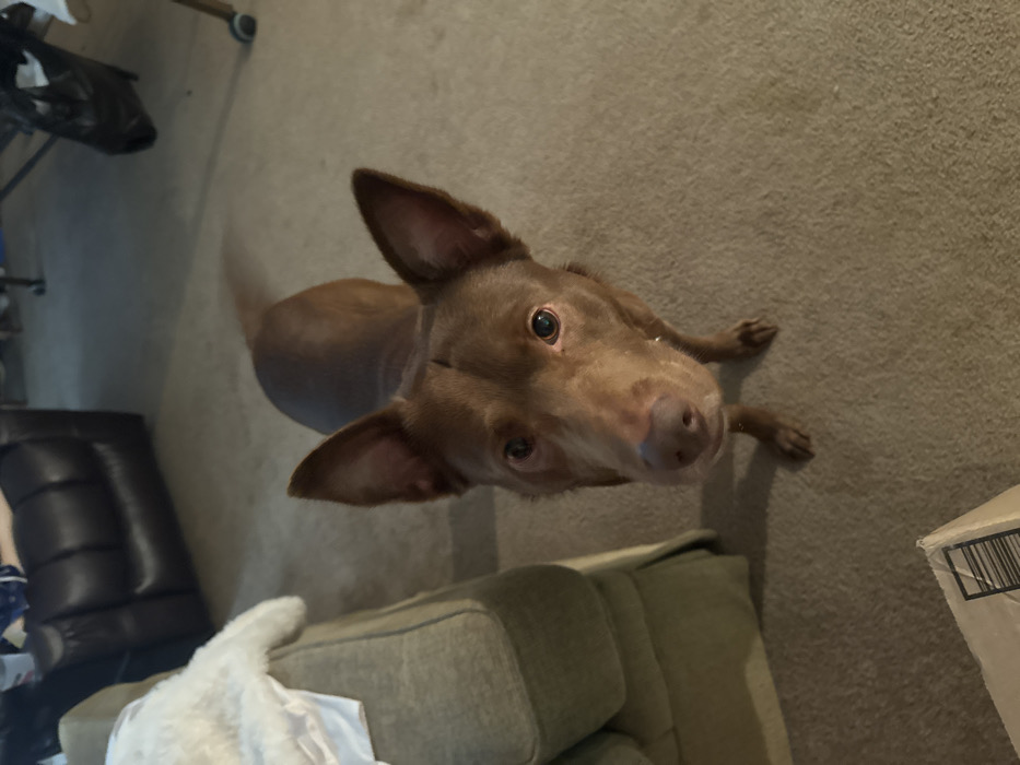 The scene is an interior residential space located in Douglasville, United States. A medium-sized domestic dog with short brown fur, erect ears, and dark eyes is centrally positioned, facing the camera directly. A light-colored collar is present on the dog's neck. The dog stands on a light beige carpeted floor. To the immediate left, a portion of a green upholstered furniture item is visible, draped with a white, textured blanket. Further left and in the background, a dark brown leather armchair is present. In the lower left foreground, a white cardboard box with a black barcode is partially visible. Additional dark, indistinct furniture and a wheeled container are discernible in the background. The environment is illuminated by ambient indoor lighting.
