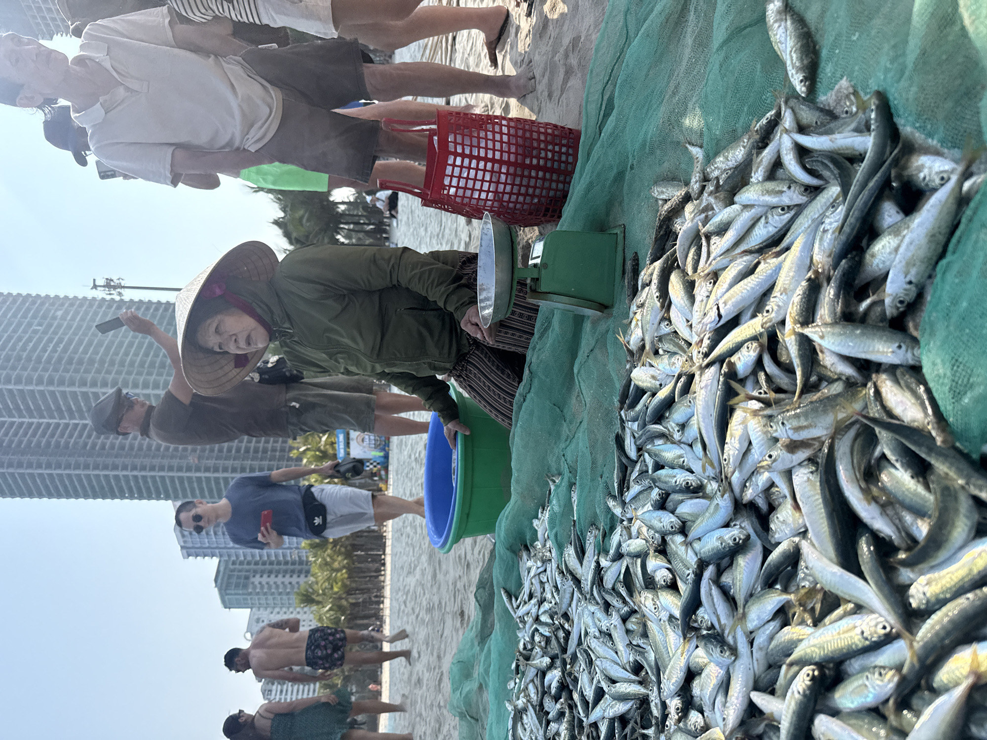 A daytime scene on a sandy beach in Đà Nẵng, Vietnam, features a fresh catch of fish and multiple individuals