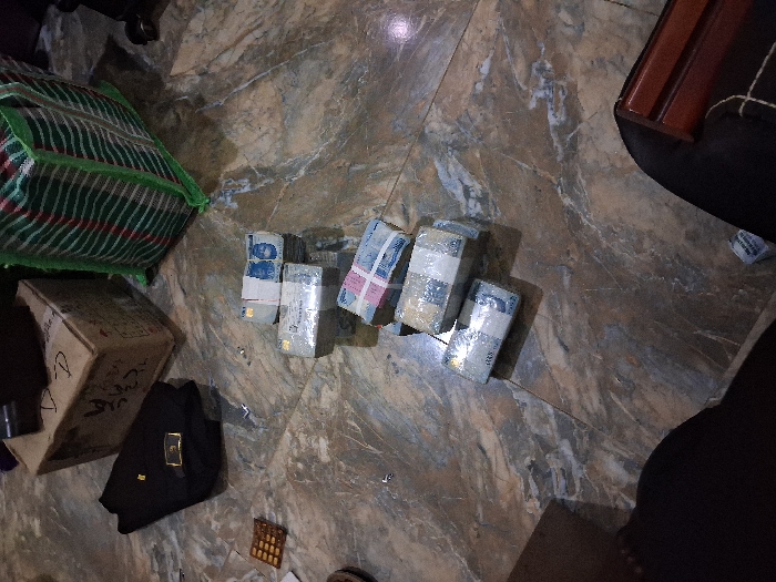 The scene is set indoors on a mottled brown and grey tiled floor in the city of Howayi, Nigeria. Six bundles of currency, identified as Nigerian Naira, are centrally arranged on the floor. One bundle is marked N2000, while others display characteristics consistent with 500 Naira and additional denominations, with some bundles wrapped in clear plastic and others banded. In the upper left, a brown cardboard box with black markings (including "D" and "P") rests next to a folded black fabric item adorned with a gold-colored buckle or emblem. A large, striped green, white, and red woven bag is visible in the upper right background. A small, rectangular, grid-patterned object with a gold hue is on the floor near the black fabric. A partial view of a human leg in dark trousers is present in the lower left, and a section of a dark armrest with a wooden accent appears in the lower right. No direct human actions or interactions are depicted.