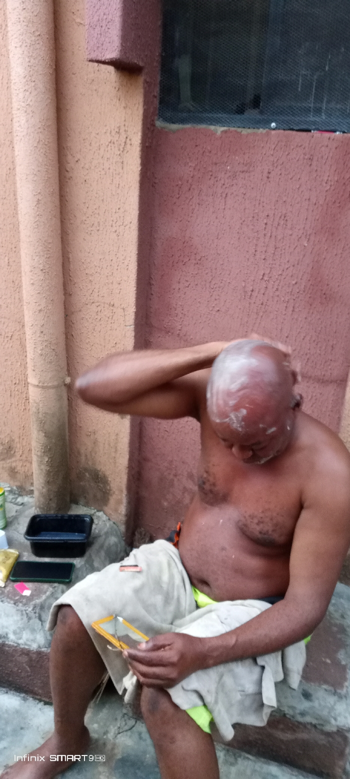 A bald, shirtless man sits outside a building. He is applying a white substance to his head with his left hand while looking at a small, rectangular object in his right hand. A black container and a smartphone sit nearby. The building has vertical pipes and a small window with a wire mesh screen. The man is wearing a cloth and green short.