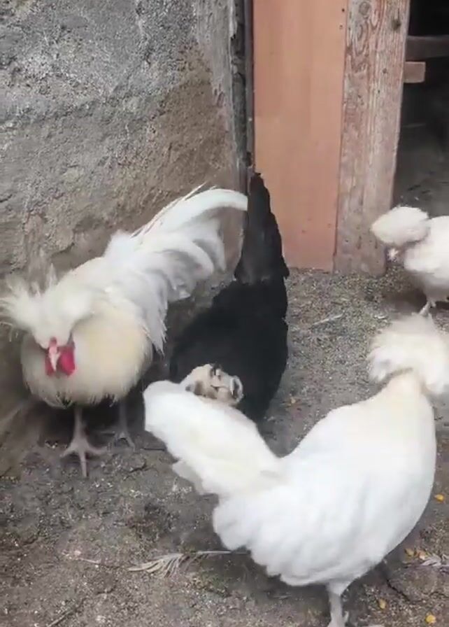 several chickens pecking at the ground in what appears to be a chicken coop or enclosure. There are three white chickens and one black chicken, identifiable by their plumage. The ground is covered with a mixture of dirt, sand, and scattered corn kernels. A grey concrete wall is visible on the left side of the frame and a weathered wooden door frame stands on the right. In the background, visible through the doorway, is a small dish of feed. One of the white chickens has a distinctive crest or tuft of feathers on its head.