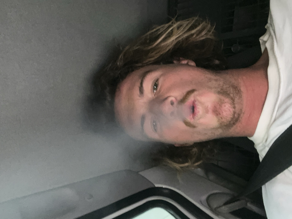 A selfie taken from a low angle captures a person inside a vehicle. The individual has light skin, wavy blonde hair, and a sparse beard with a mustache. They are wearing a white t-shirt and have a seatbelt across their chest. Smoke partially obscures their face. The interior of the vehicle is visible, with the ceiling and window frame appearing in the shot. The overall image is slightly blurry.