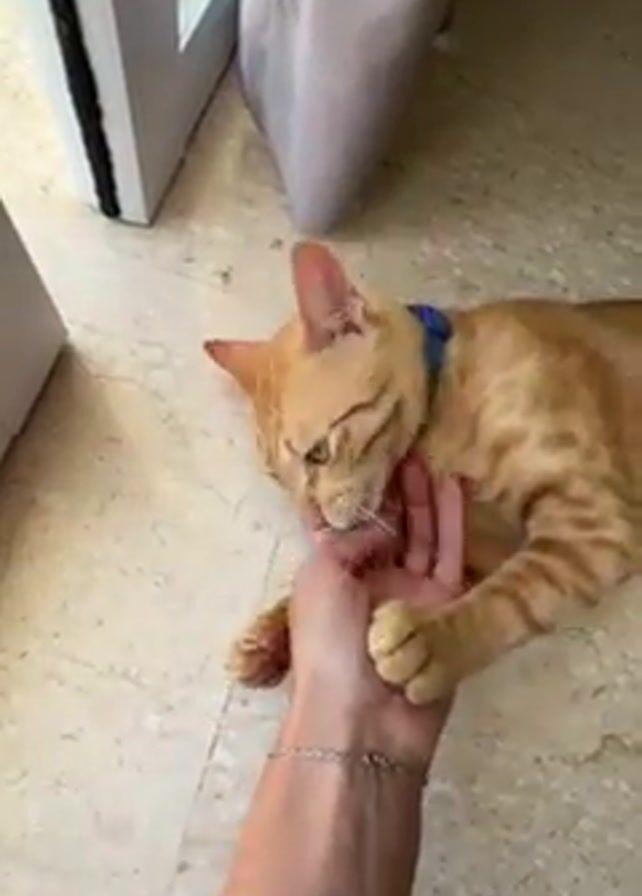 A person's hand is visible stroking a ginger tabby cat wearing a blue collar that is lying on a marble floor. The cat is seen to be yawning with its mouth open and claws out grabbing the person's hand.