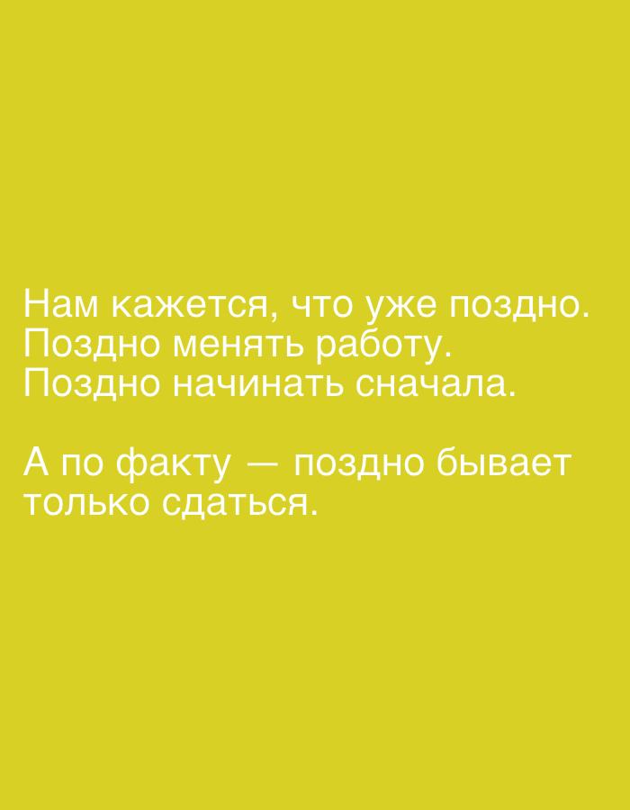 A digital graphic, identified as being in Nizhny Tagil, Russia, displays a solid yellow background. White sans-serif Cyrillic text is centrally positioned in the lower half of the frame. The text consists of five lines of Russian, translating to: "It seems to us that it's already too late. Too late to change jobs. Too late to start over. But in reality — it's only too late to give up." No people, subjects, objects, actions, interactions, or environmental elements beyond the background color and text are present.