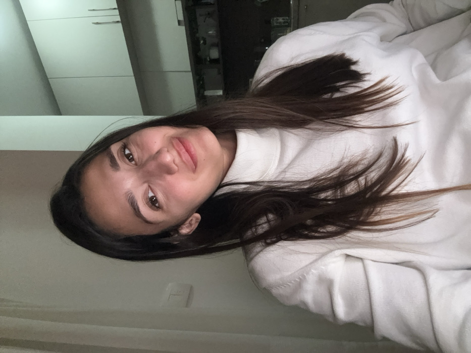 A young woman with long, dark brown hair, slightly parted, smiles gently. She is wearing a white, long-sleeved sweatshirt. The background includes a white wall, a light switch, and white cabinets with silver handles. The overall lighting is soft and diffused, creating a calm and inviting atmosphere. The photo is rotated and appears to have been taken indoors.