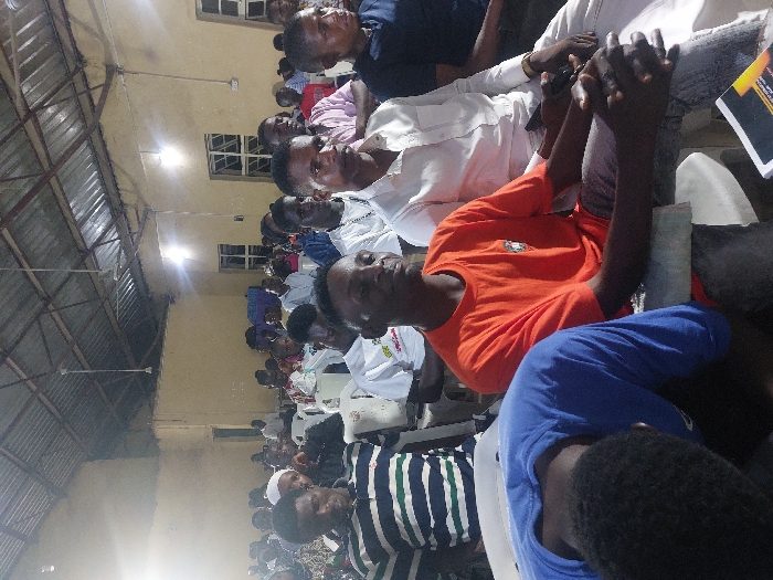A large group of people are seated in rows, likely attending an event or gathering in a large room. The room has a metal roof with exposed beams. Many individuals are looking toward the front, with some focusing on the camera. The lighting appears to be a mix of natural and artificial, creating a bright yet slightly dim atmosphere. Clothing styles vary, indicating diverse backgrounds among the attendees. The perspective suggests the photo was taken from the side, capturing the depth of the room.
