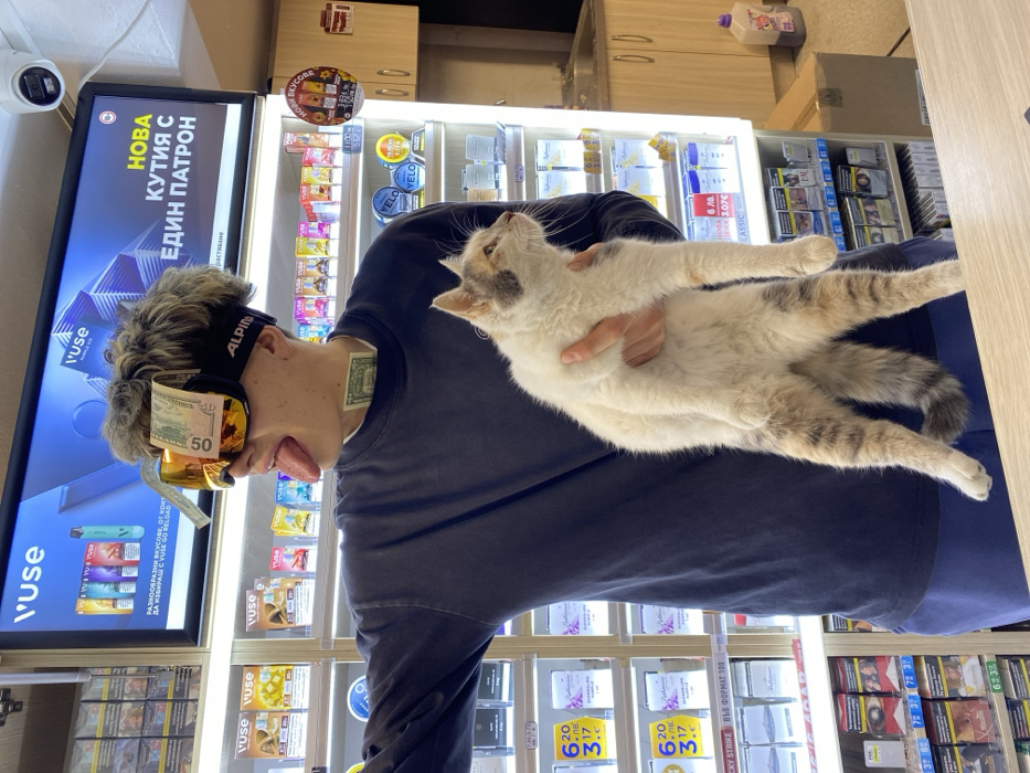 The scene depicts the interior of a retail establishment, likely a convenience store or kiosk, located in Silistra, Bulgaria. A young individual with short, light brown hair is positioned centrally, wearing dark ski goggles pushed up onto their forehead. A $50 US dollar bill and a $1 US dollar bill are tucked into the goggles, while another $1 US dollar bill is placed inside the collar of their dark blue long-sleeved shirt. The individual is looking towards the right of the frame with their tongue fully extended. They are holding a medium-sized, short-haired cat with both hands, supporting its body in an upright position. The cat is predominantly white with patches of tan and grey fur, particularly on its head and tail, and is looking towards the right. The background features brightly illuminated display shelves stocked with various packaged products, including what appear to be tobacco items, with visible price labels in Bulgarian Leva. Above these shelves, a large digital screen advertises "Vuse" vaping products, displaying text in Bulgarian that translates to "NEW BOX WITH ONE CARTRIDGE." A white CCTV camera is mounted on the ceiling in the upper right portion of the frame. To the right of the display shelves, a section of light-colored cabinetry with an integrated sink is visible.