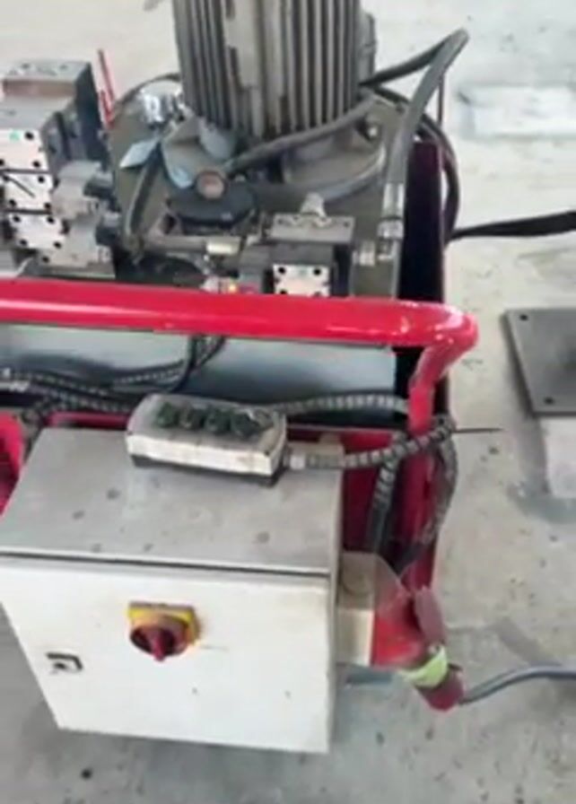 large hydraulic system in a factory or industrial setting. The system includes a red-framed power unit with a motor, hydraulic pump, control panel, and electrical connections. The power unit is connected to a long, black, conveyor-like structure with evenly spaced, textured pads along its surface. The conveyor is supported by a black stand and extends into the distance towards a wall of windows. The environment appears to be a large open space with a concrete floor. Additional equipment and materials can be seen in the background, along the walls and under the windows. The video focuses on the hydraulic system and its connection to the conveyor structure, emphasizing the size and industrial nature of the equipment.