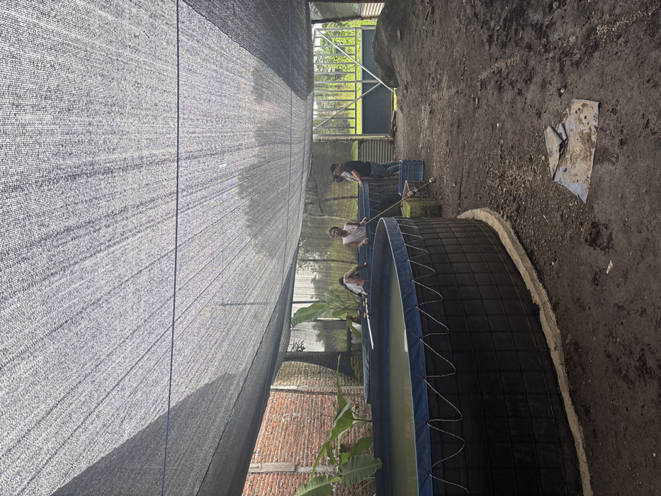 An outdoor aquaculture facility in Tambakrejo, Indonesia, is observed under a large black mesh shade net