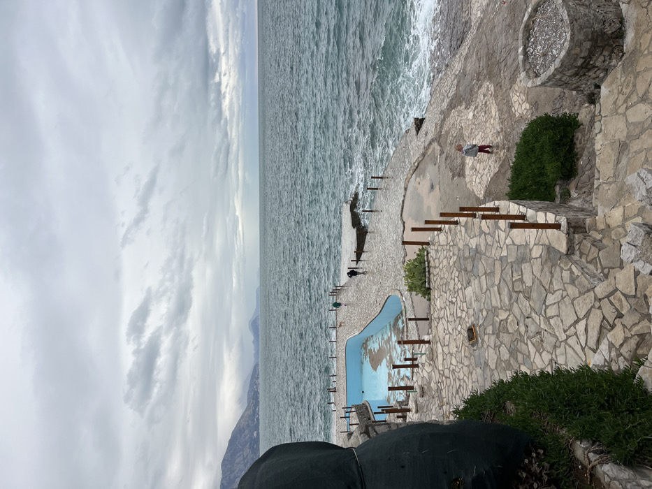 The image depicts a coastal scene in Prijevor, Montenegro, under an overcast sky with heavy grey clouds
