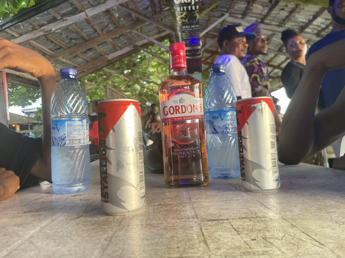 On a textured surface, two bottles of water flank a "Gordon's" gin bottle, and two silver cans are labeled "I-Stallion." People are visible in the background, with a black sign with white writing above them. The area has a weathered, outdoor feel, with a wooden structure overhead. Partial views of people's arms and clothing frame the foreground.
