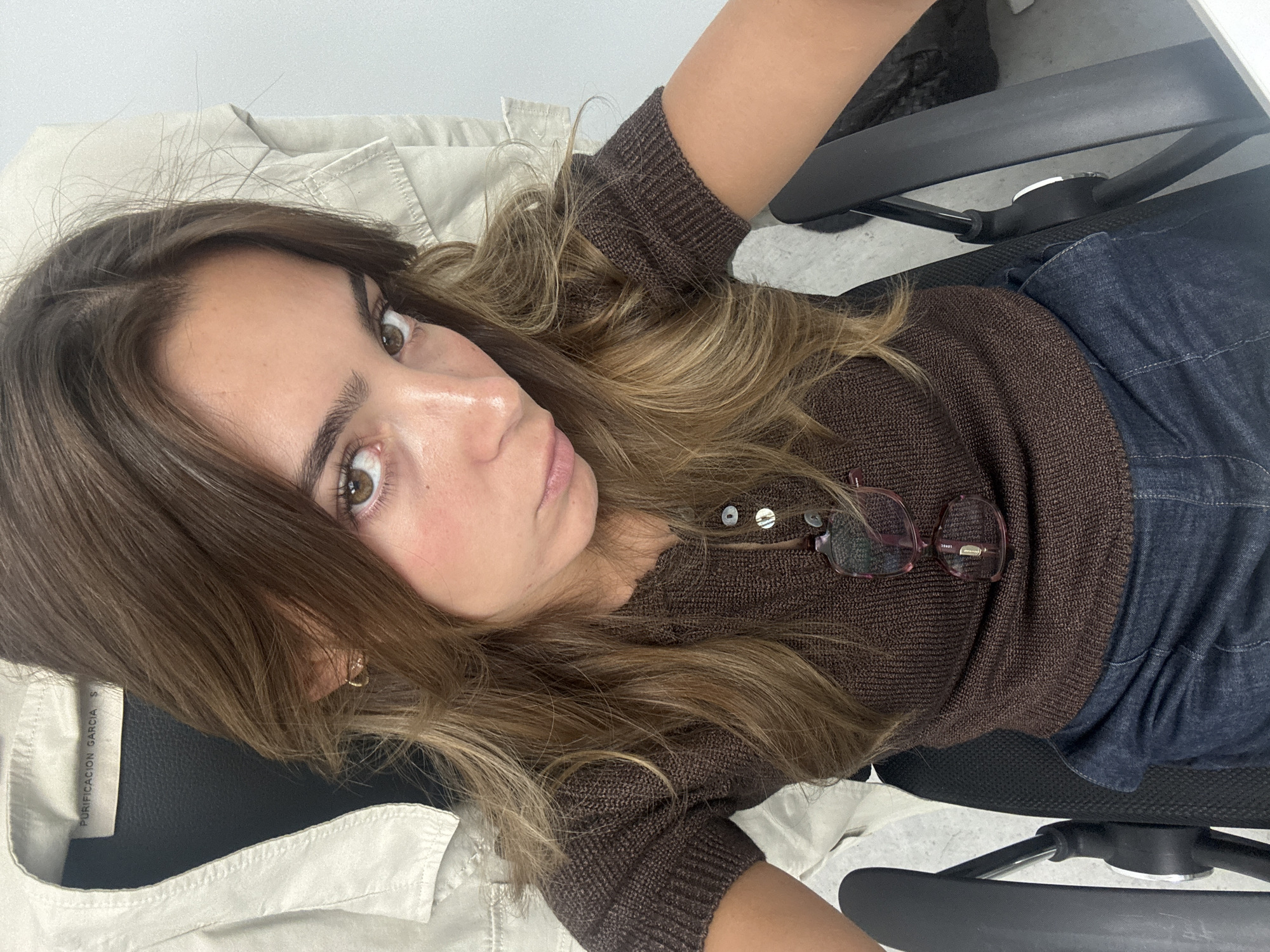 A female individual is depicted in a close-up, chest-up view, seated in a black office chair within an indoor environment in Torres Vedras, Portugal. She has medium brown hair with lighter highlights, brown eyes, and a light-to-medium complexion with visible blush. Her expression is a pout, and she is looking directly at the camera. She wears a short-sleeved, dark brown ribbed knit top with three light-colored buttons. A pair of eyeglasses with reddish-maroon frames hangs from the neckline of her top. A gold-colored hoop earring is present in her left ear. She is also wearing dark blue denim trousers, partially visible below her top. Behind her, a light-colored, possibly beige or off-white, garment with a "PURIFICACION GARCIA S" label is draped over a support, likely another chair or hanger. The background is a plain, light-colored wall.
