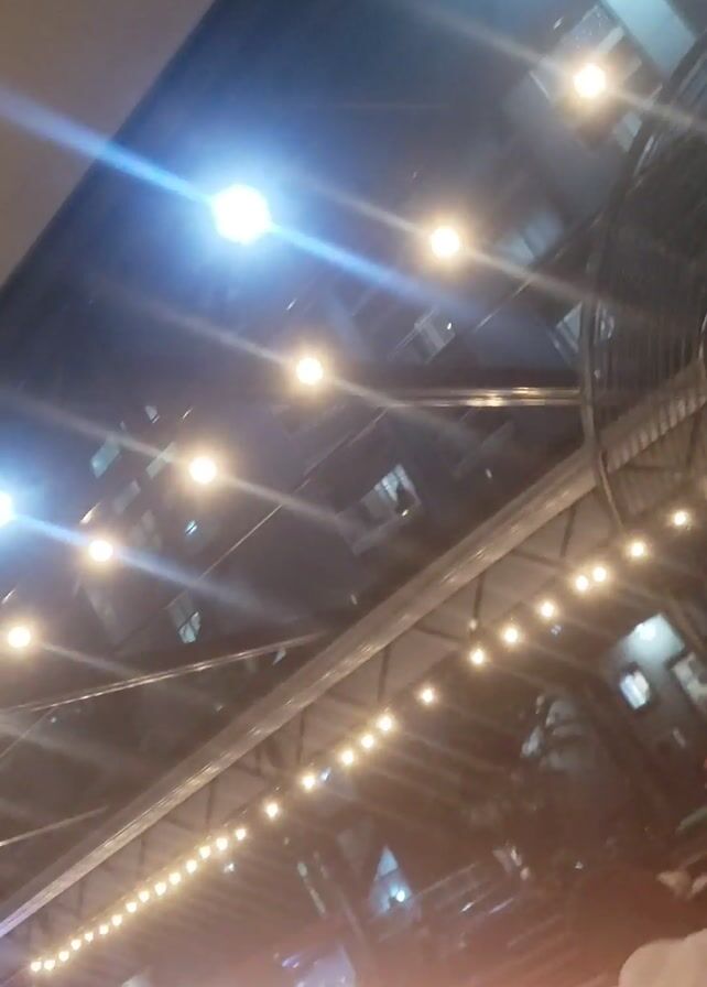 n interior space with high ceilings decorated with rows of lights. There are black metal structural elements visible and a large black fan spinning overhead. A few people are partially visible, sitting at tables below. The overall impression is of a public or commercial space.