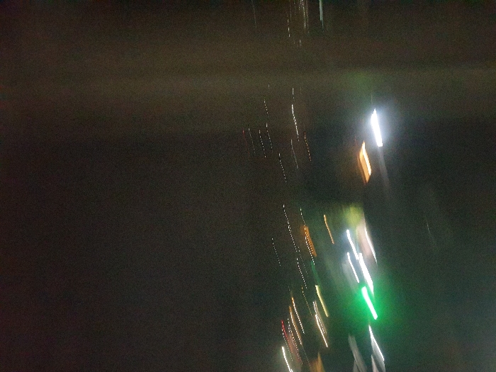 A dark, blurry image displays streaks of light in various colors – white, yellow, green, and red