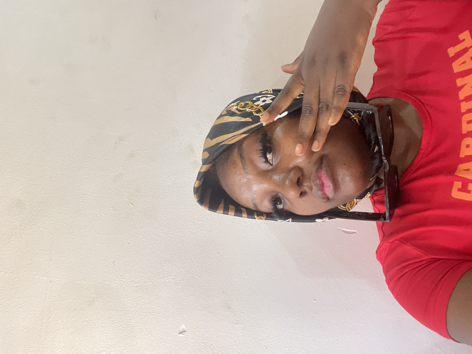 A young adult Black female is depicted in a close-up, chest-up shot, indoors in Lugbe, Nigeria, against a plain, light-colored wall with minor surface imperfections