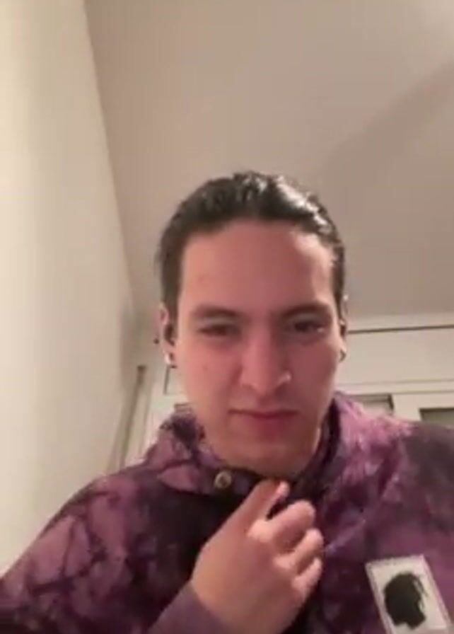 young man wearing a purple tie-dye hoodie. He is looking at the camera. He pulls the hood over his head and then gives two thumbs up, smiling. He has long dark hair pulled back in a bun and earrings. The background is a plain white wall.