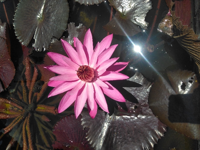 This image, captured in Phouviang-Gnai, Laos, displays an aquatic scene featuring a single, open pink water lily flower centered on a dark water surface. The flower is characterized by multiple pointed, deep pink petals radiating from a textured, reddish-brown central structure. Surrounding the flower are several water lily pads of various sizes and shades; some are dark and appear leathery with visible surface textures, while others are lighter or partially submerged. In the upper-left quadrant, a submerged aquatic plant structure with dark, ribbed, radiating segments is visible. A distinct starburst-shaped lens flare, indicative of direct sunlight reflection, is present on the water surface in the lower-right portion of the frame. No human or animal subjects are depicted. The environment consists solely of water and various aquatic flora under natural light conditions.