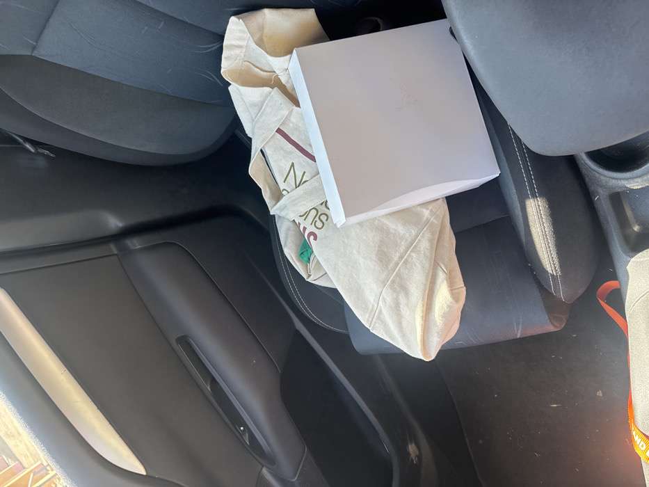 The image depicts the interior of a vehicle, specifically the front passenger compartment, presumably located within Sélestat, France, though no external landmarks are visible to confirm this precise location. A dark-colored fabric passenger seat occupies the central and right portions of the frame. On this seat, a beige or off-white canvas tote bag is positioned, partially collapsed. The bag displays text, with "SUGGESTION" and visible "N" and "S" characters discernible, and contains an unseen green item. Adjacent to the tote bag, a square white cardboard box with a lid rests on the seat. The box exhibits a faint, embossed design on its top surface. The car's interior is predominantly dark, with a black front passenger door panel visible on the left side of the frame. This panel features a horizontal silver-colored trim piece along its top edge, a recessed door handle, and a window control panel below it. A dark center console with an armrest and cup holders is partially visible in the lower right corner. An orange strap is present on the dark floor mat near the console, and the floor mat shows minor debris. Natural light enters the vehicle from the upper left. No individuals are present or visible within the scene.