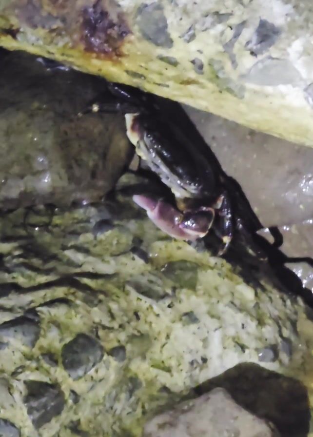 crab in a rocky environment. The crab is dark-colored and has a pink claw, and it is partially hidden under a rock structure with water nearby. Some rust is also visible on the underside of a rock in the structure.