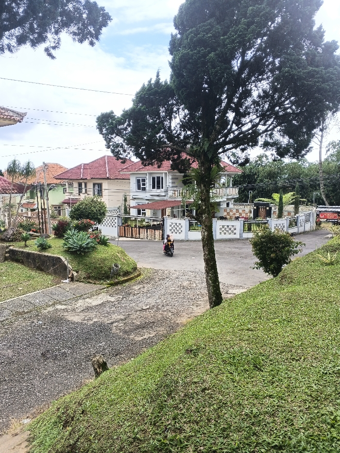 This image depicts a residential street scene in Pô Kô, Vietnam, under a partially cloudy daytime sky. In the foreground, a steep grassy slope occupies the right and lower-left, bordering a paved road that curves from the lower-left towards the center-right. A large, dark green coniferous tree with visible ferns on its trunk stands prominently on the right side of the road. On the road, a single individual, clad in light clothing, is operating a dark-colored motorcycle, traveling away from the camera towards the right. To the left of the road, a landscaped island features various succulent plants and shrubs, bordered by a concrete curb. Behind this, multiple multi-story houses are visible, all featuring red-tiled roofs. The most prominent house on the right is white with balconies and a dark-colored gate within a decorative white fence. Further left, other houses display beige and light green exteriors. Power lines are visible stretching across the scene. The background consists of dense green foliage and trees.
