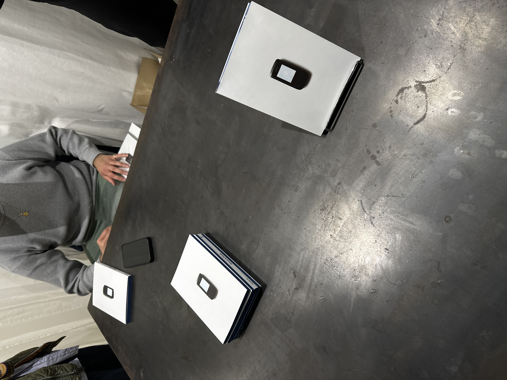 The image displays an indoor scene set in Paris, France, centered around a large, dark, industrial-style metallic table. The table surface is visibly worn, featuring scratches, scuffs, and faint marks. On the table, three distinct arrangements of identical white-covered booklets are present. Each booklet's cover prominently features a centered, black outline illustration of an older-model mobile phone with a blank screen. Two of these arrangements are stacks of multiple booklets, identifiable by their dark blue spine edges. The stack on the far right has a partially visible title, "Stress & Places," printed on the spine of its top booklet. The third booklet lies as a single item near the top-center of the table. Between the booklet arrangements, a black smartphone with its screen off or face down is positioned. Three individuals are partially visible behind the table. To the left, a person is seen wearing a striped shirt underneath an olive green quilted vest that bears a circular "M.A.P. Original" patch. In the center, a seated individual wears a light grey waffle-knit sweater and light green pants, with a gold pendant visible around their neck. Both of this person's hands rest on white papers or small booklets directly on the table in front of them, suggesting an interaction with the items. To the far right, only a partial black sleeve and garment of a third individual are visible. The background consists of draped white fabric, likely curtains or a temporary wall covering, and a brown cardboard box positioned on the floor or a lower surface behind the table to the right of the seated person. The lighting is even and diffused throughout the scene.