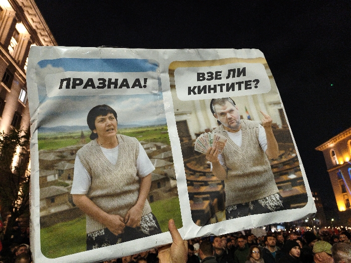 A protest sign depicts two images, possibly political figures. The left image shows a woman with a stern expression against a rural backdrop, labeled "ПРАЗНАА!". The right image features a man holding a stack of cash while extending his middle finger, set against what appears to be an assembly hall, with the text "ВЗЕ ЛИ КИНТИТЕ?". The sign is held aloft amidst a crowd, presumably during a demonstration, with surrounding buildings illuminated in the background.