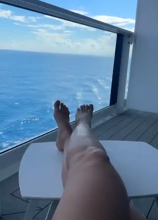 first-person perspective of someone lying with their legs extended onto a small, white, rectangular table on a balcony. The person's bare feet are visible at the top of the frame. Beyond the balcony railing, there is a wide expanse of blue ocean under a partly cloudy sky. The balcony's flooring appears to be composed of narrow, horizontal planks. The walls of the balcony are white. The view suggests the person is on a cruise ship.