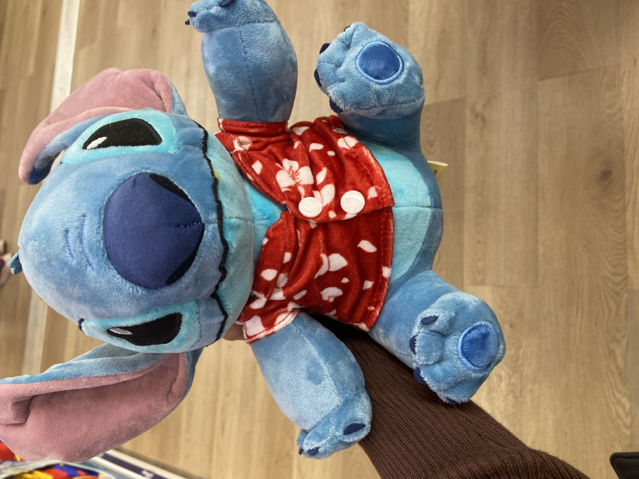 A plush toy of Stitch from Disney's "Lilo & Stitch" is being held. Stitch is blue with pink ears and a large, dark blue nose. He wears a red shirt with white floral patterns and two white buttons. Stitch's arms and legs are outstretched, with blue paws visible. The background includes a light wooden floor and a person's arm wearing a brown sleeve.