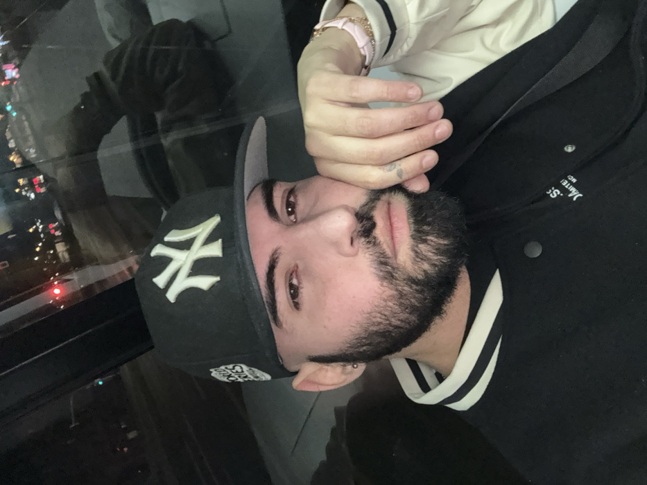 A man with a beard and a black New York Yankees baseball cap looks directly at the camera. He wears a black jacket with white trim and a light-colored jacket over it. His left hand rests on his face. A small tattoo is visible on his hand. The background suggests an urban setting with blurred lights visible through a window. The image is rotated counterclockwise.