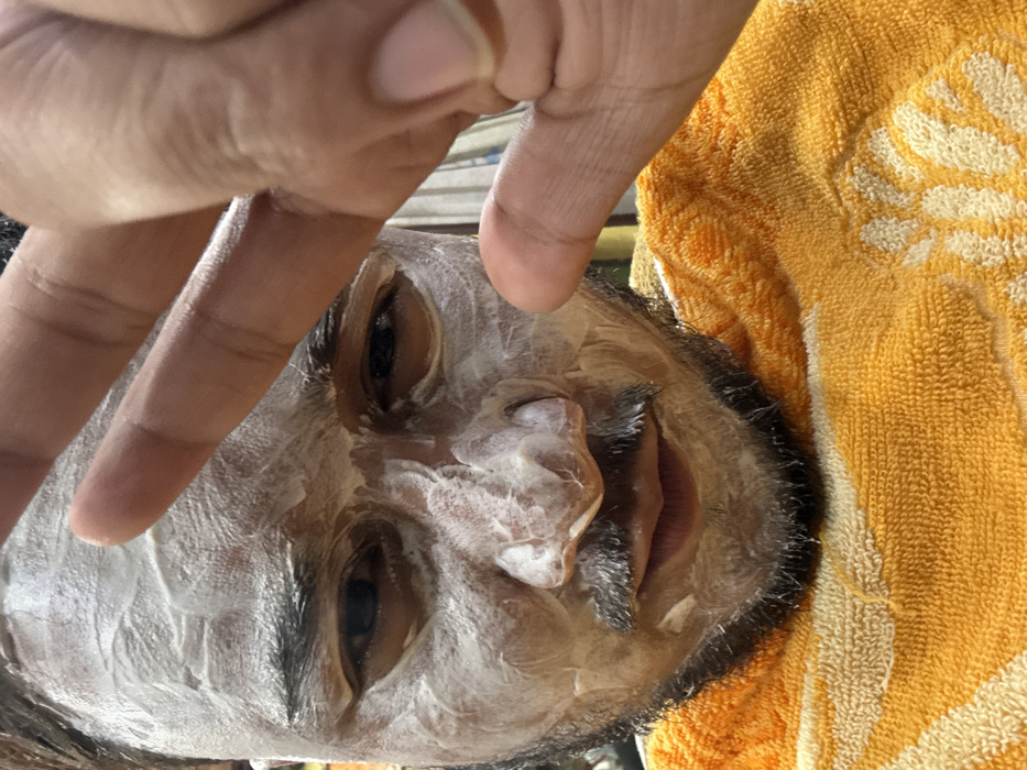A close-up portrait depicts an individual, likely male, located in South Dumdum, India. The subject's face is largely covered with a thick, white, creamy substance, consistent with a facial mask. Visible features include dark eyes looking directly at the viewer, and a dark beard and mustache, partially obscured by the white mask. A hand, matching the subject's apparent skin tone, is raised in front of the upper right portion of the face, with three fingers (index, middle, ring) splayed in a "V" formation, partially obstructing the view of the subject's right eye and temple. The individual is draped in an orange terry cloth towel featuring a lighter, patterned design around the neck and chest area. The background is blurred, indicating an indoor environment.