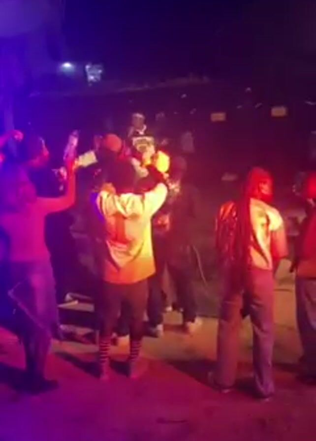 At night, a group of around ten people are gathered in a semi-circle at what appears to be a party or outdoor event. They are illuminated by flashing red, green, and blue lights, creating a dynamic atmosphere. Most of the individuals are turned towards the center of the group, with some raising their arms in the air, dancing, or filming with their phones. One person in a yellow shirt stands out. The environment is dark, suggesting a nighttime setting, with some visible trees and a possible building in the background. The scene suggests a lively, music-filled celebration.