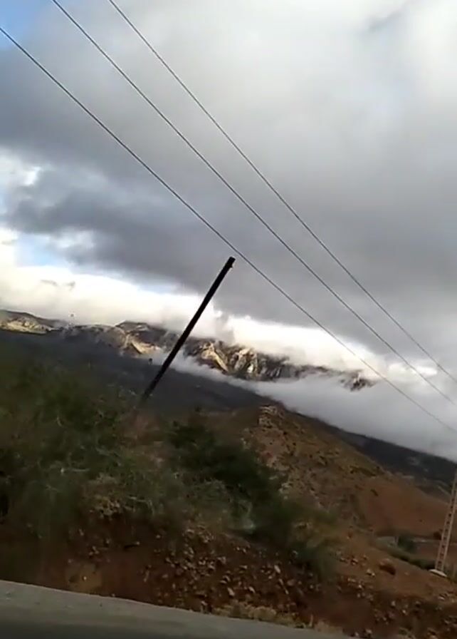 mountainous landscape under a cloudy sky. Power lines and utility poles are prominent in the foreground. The mountains in the distance are partially obscured by clouds. The ground is rocky and covered with sparse vegetation. A paved road is visible in the lower part of the frame.