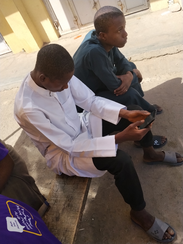 An outdoor scene in Fagge A, Nigeria, features three individuals in daylight