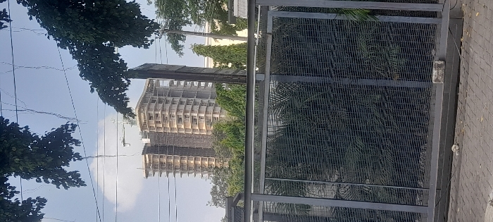 The scene is in Falomo, Nigeria. A multi-story building under construction dominates the midground. It features a concrete skeletal structure, with a prominent darker, unfinished facade section and a visible construction crane at its apex. A dark grey metal mesh fence, supported by vertical and horizontal beams, occupies the foreground. Behind the fence, dense green foliage partially obscures the lower sections of the construction site and other distant structures. The upper portion of the frame shows a light blue sky with power lines, partially framed by dark green tree foliage and hanging vines. The ground level in the foreground consists of paved interlocking bricks, with a concrete curb at the base of the fence where a single light-colored brick rests. No human subjects are present.