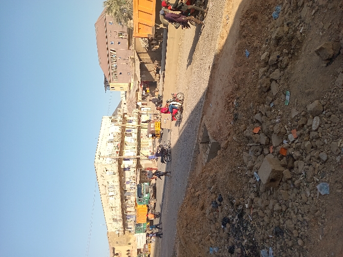 An urban scene presents a row of multi-story buildings with light-colored facades on one side. Trucks and motorcycles populate the street, suggesting a bustling environment. Contrasting this, the opposite side features a barren area of dirt and rocks, with scattered debris. The sky is a clear blue, indicating a sunny day. An orange building sits further back.