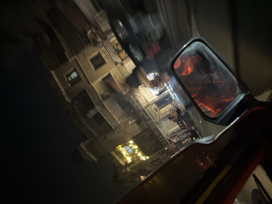 An upside-down street scene is viewed through a car's passenger-side mirror at night. Buildings line a narrow street, their windows visible. A string of lights adorns one building. The car's red dashboard and side mirror frame the view of the street. The mirror itself reflects a blurry, reddish image.
