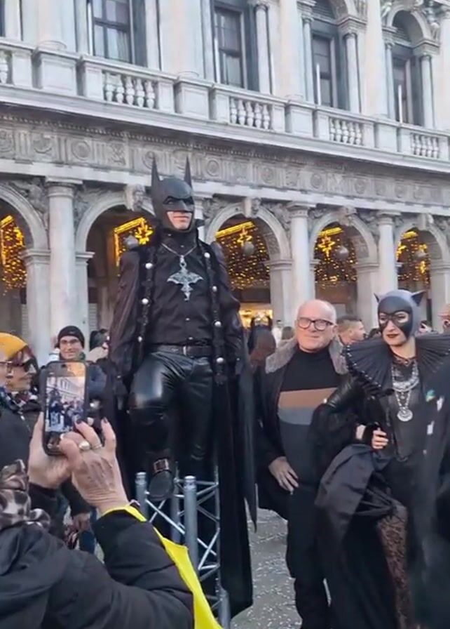 Here's a detailed description of the video: The video appears to be taken at a carnival or festival, likely in a European city due to the architecture. The scene is crowded with people. The initial focus is on a person dressed as Batman, standing on a small platform amidst the crowd. The Batman costume is black and includes a cape. People are taking pictures of them with their phones. In a subsequent shot, a person dressed as Catwoman is seen standing next to Batman. The camera pans across the scene, revealing more of the crowd and the surrounding architecture. There is a building with a banner that reads "I Musei di Piazza San Marco." Later, the camera focuses on a stage with large columns, which appear to be part of a set designed to resemble ancient Greek architecture. People are standing around the stage. The overall impression is of a lively public event with costumes and a festive atmosphere.