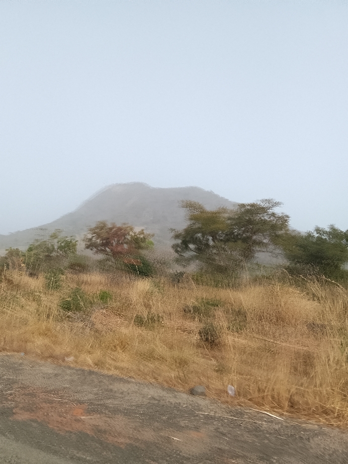 The image depicts a rural landscape near Gu, Nigeria, under foggy or hazy atmospheric conditions