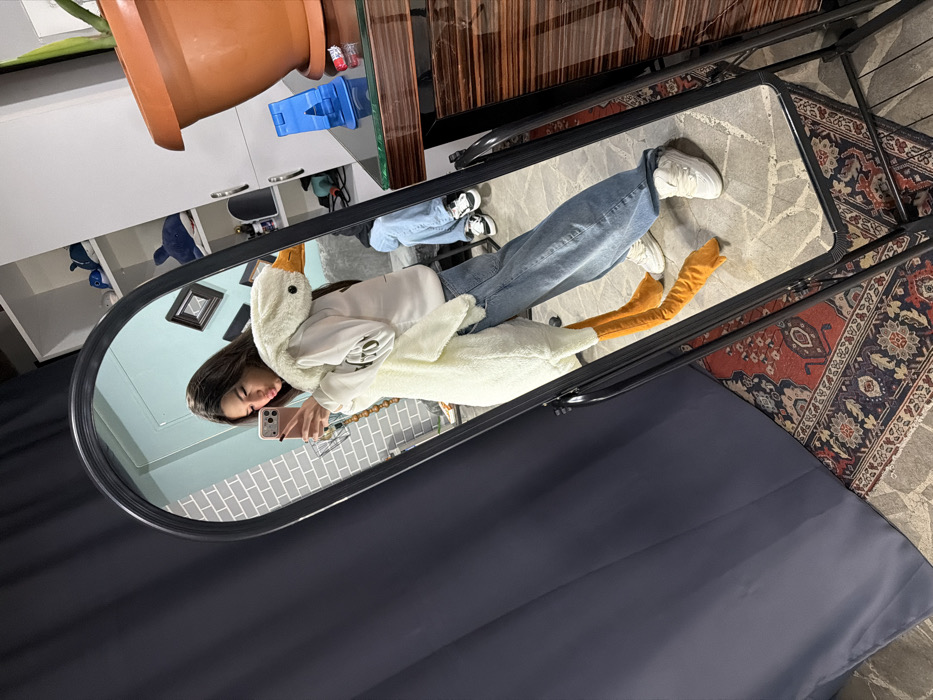 The scene depicts an indoor environment in Yerevan, Armenia, captured through the reflection in a full-length, arched mirror with a black frame