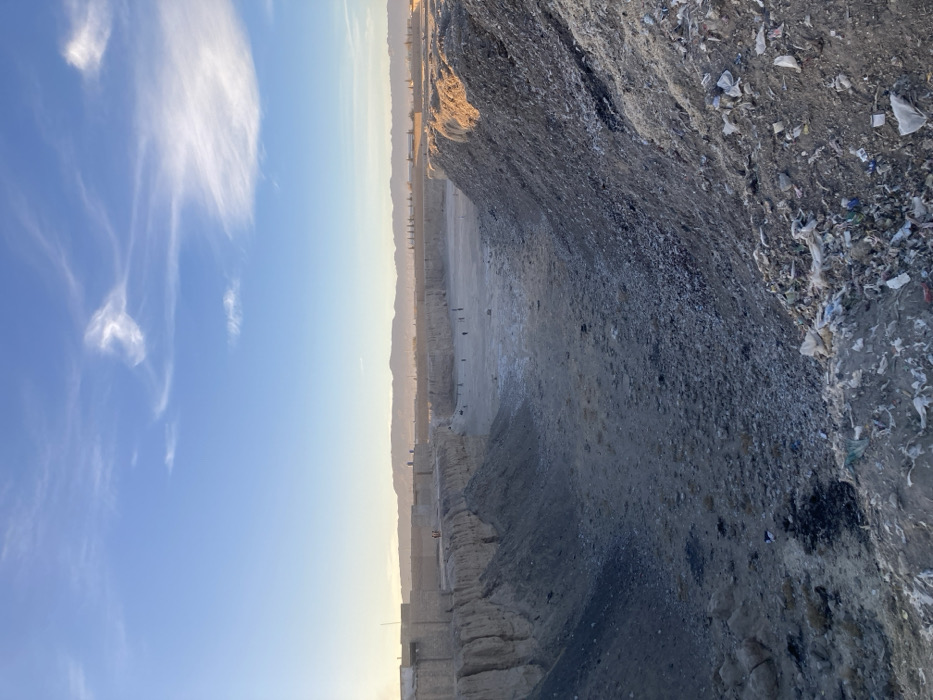 wide landscape with a clear blue sky streaked with cirrus clouds. In the distance, low mountains are visible. The foreground features a large open pit or quarry, with exposed rock and soil formations. A significant amount of scattered debris or trash is seen on the right. The overall impression is of an industrial or extractive site under a clear sky.