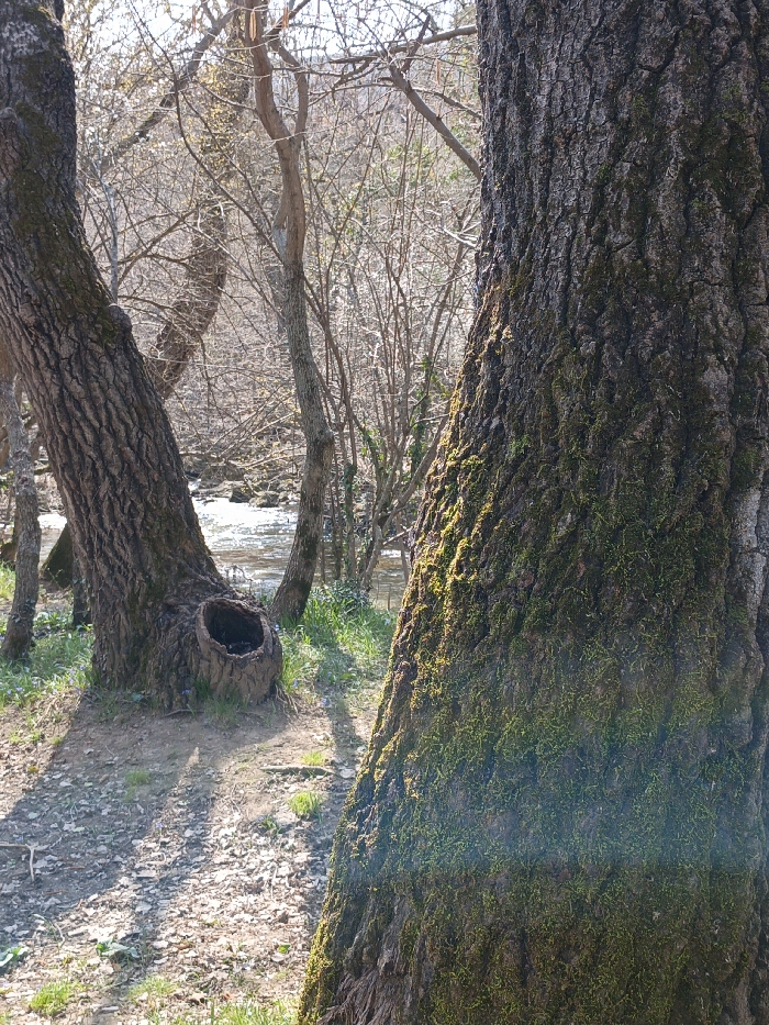 The image depicts a natural outdoor scene along a body of water, located in the Balaklavskyi District, Ukraine. In the foreground, two large tree trunks are prominent. The trunk on the right features dark, deeply furrowed bark extensively covered in bright green moss, brightly illuminated by direct sunlight, which also produces a horizontal lens flare across its surface. To the left, another large tree trunk, angled towards the left, displays rugged dark bark and a distinct, deep, circular hollow at its base. Beyond these trees, a sunlit river or stream flows, reflecting bright light. The midground and background consist of numerous smaller deciduous trees and shrubs with bare branches, indicative of late winter or early spring, interspersed with patches of light green grass and earth. The ground is composed of light-colored soil and debris, with shadows from the trees visible under bright, clear daylight. No people, animals, or man-made structures are present.