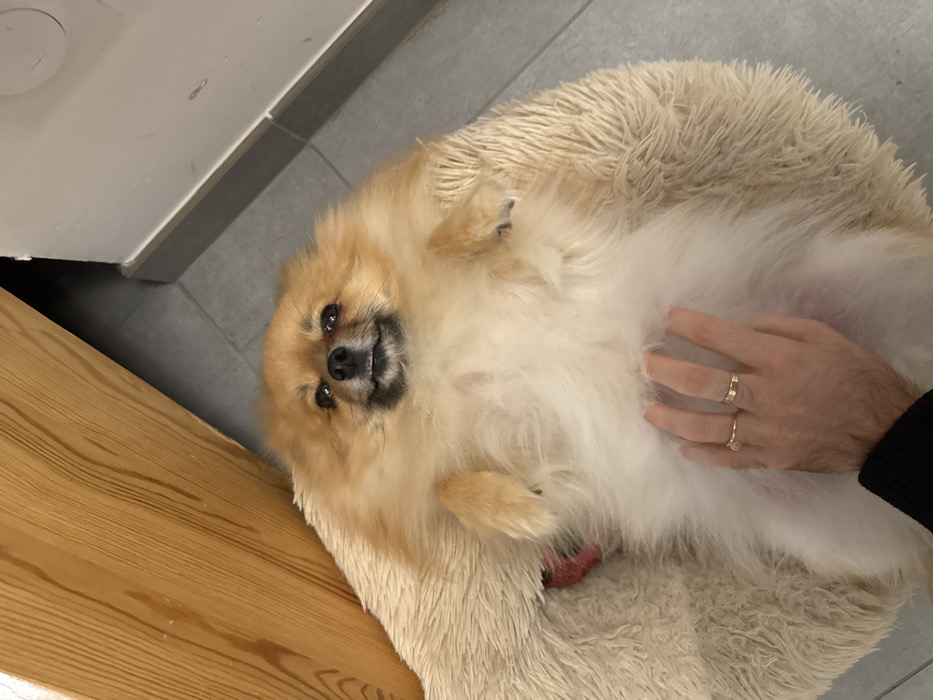 A Pomeranian dog, displaying light brown and cream-colored fur, lies on its back within a cream-colored, fluffy circular dog bed. Its front paws are curled near its chest, and its mouth is slightly open, revealing teeth, consistent with a grinning expression. A human's bare left hand, wearing two gold-colored rings on the fourth finger, is positioned on the dog's cream-colored belly, engaged in a petting motion. The human's lower forearm, exhibiting hair, is visible, partially obscured by a dark sleeve. To the upper left, a light-colored wooden structure with vertical grain is visible. To the upper right, a white wall with a grey baseboard is present. The dog bed and subjects rest on a grey tiled floor. The scene is located in Chambœuf, France.