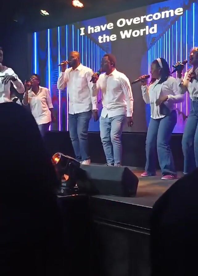 On a brightly lit stage, five individuals stand shoulder to shoulder singing into microphones. They are dressed casually in white shirts and blue jeans. Behind them, a large LED screen displays the words "I have Overcome the World" and "I know, I know". The stage is equipped with modern lighting fixtures. In the foreground, the silhouettes of audience members can be seen, indicating a live performance setting.