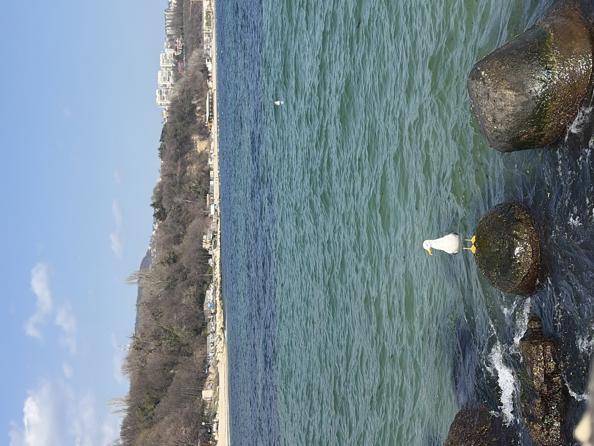 The image displays a coastal view along the Black Sea in Varna, Bulgaria, under a clear blue sky with scattered white cumulus clouds. In the immediate foreground, several dark, water-worn rocks, some appearing covered in algae, are partially submerged in the rippling turquoise-blue water. A single white seagull with yellow legs and a yellow beak stands prominently on one of the central rocks, facing left. Small waves are visible breaking against the rocks. The midground is dominated by the calm, undulating surface of the sea, which transitions from a darker blue closer to the foreground to a lighter blue in the distance. A small white object, possibly another seagull, floats on the water in the far midground. Beyond the water, a sandy beach stretches along the shore. The background consists of a steep, tree-covered hillside, populated primarily by bare deciduous trees, suggesting a non-summer season. At the base of this hillside, along the beach, are several low-rise buildings, parked vehicles, and a few indistinct human figures. Further up the hillside and to the right, multiple white multi-story apartment buildings and other urban structures are visible. Two distinct communication towers are also present on the distant tree line on the left side of the hillside.