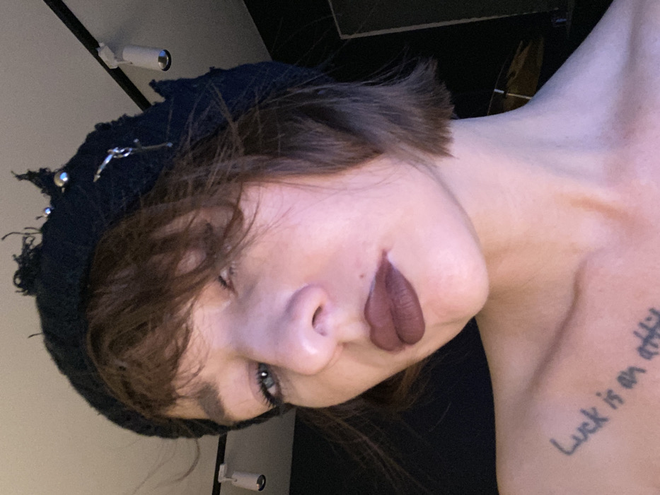 A female subject is depicted in a close-up portrait, angled slightly to her right, with a direct, unsmiling gaze towards the camera. She has short, brown hair with bangs partially obscuring her right eye. A dark, distressed knit beret or beanie is worn on her head, adorned with several metallic studs and a small silver-colored crucifix charm. Her lips are coated in a matte, dark plum lipstick. A tattoo reading "Luck is an attit[ude]" is visible on her left clavicle area. Her bare left shoulder is visible. The background is dark and indistinct, with two white cylindrical spotlights mounted on a black track lighting system visible overhead. The scene is located in Ust-Ilimsk, Russia.